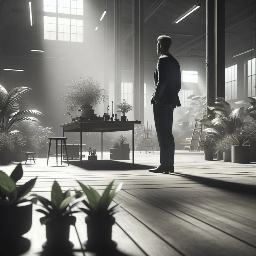 A hyperrealistic grayscale image with plants and trees out of focus in the foreground. In the background, there is a large hall with a wooden plank floor and a workbench. A stylish middle-aged man in a suit is standing by the workbench. The lighting comes obliquely from floor-to-ceiling windows, and the air is dusty enough to make the light beams visible. Assume a 50mm lens.